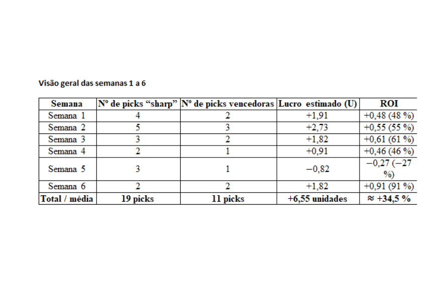 Em 4 das 6 semanas, o ROI estimado foi positivo. A semana 5 teve resultado negativo (uma das raras semanas onde os apostadores do dinheiro inteligente erraram mais). No acumulado, seguindo essa amostra, apostar com os sharps teria rendido +6,55 unidades, com ROI estimado de 34,5 %. A taxa de acerto média (58 %) é bastante superior ao “monte” estatístico esperado de azar puro.